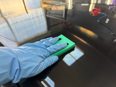 一気に施工するのではなく、 1パネルずつ状態を確認しながら進めることで、ムラや仕上がりの差を防いでいます。(施工の工程は本番の施工と全く同じ工程で、メンテナンスの場合は1層)