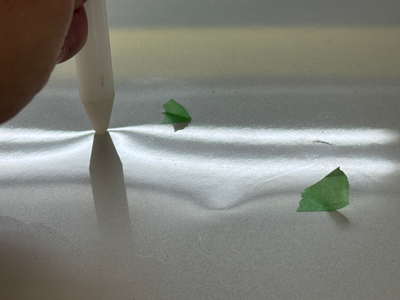 専用接着剤を使い、凹み部分にタブを貼り付け、引き出しながら形を整えていきます。