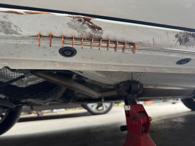 今回の修理は、右側サイドシル後方下部を中心に、約1mにわたって広がるへこみ。