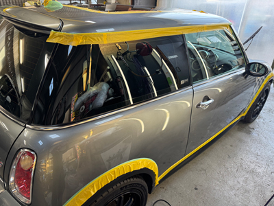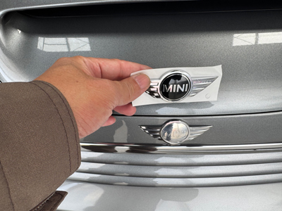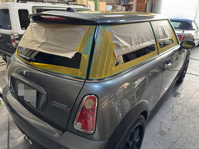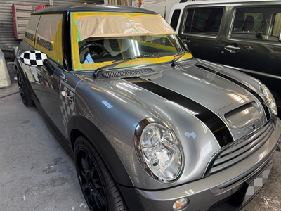 本日の作業場ブログは、お得意様のミニがヒョウ被害修理から無事復活し、さらに今回はガラスコーティング施工と、リアバンパーのズレ補修・エンブレムのリニューアル作業をご紹介します^^