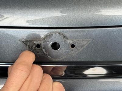 続いては、経年劣化で塗装が剥がれてしまったリアエンブレムの貼り替え。
